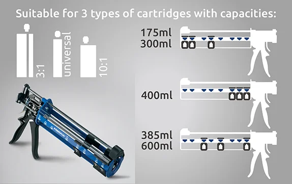 Puiki pusiausvyros ir valdymo sistema leidžia spaustuvą naudoti ne tik dervoms, bet ir silikonams, akrilams bei klijams – taip tiksliai išspausite reikiamą medžiagos kiekį.