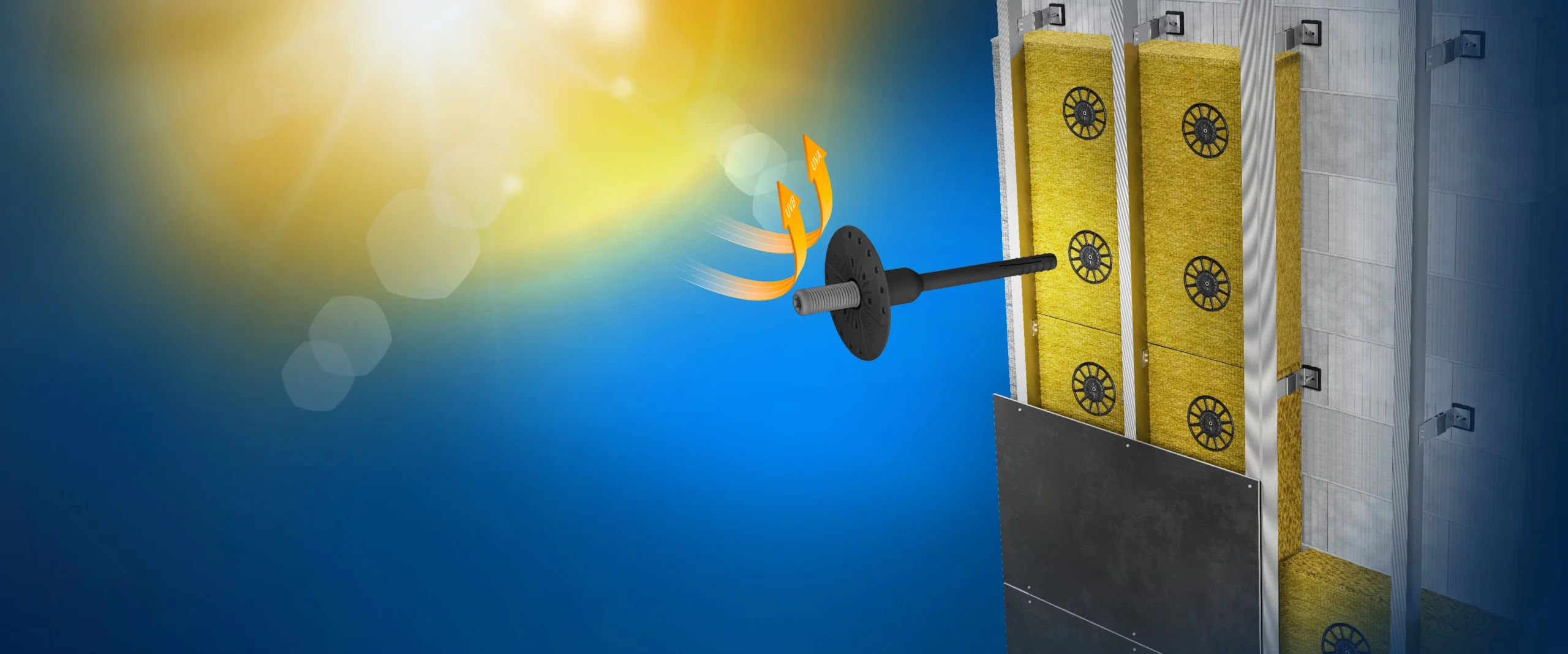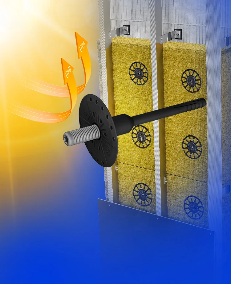 Specialus izoliacijos tvirtinimas vėdinamiems fasadams, atsparus UV poveikiui ir turintis ETA sertifikatą.