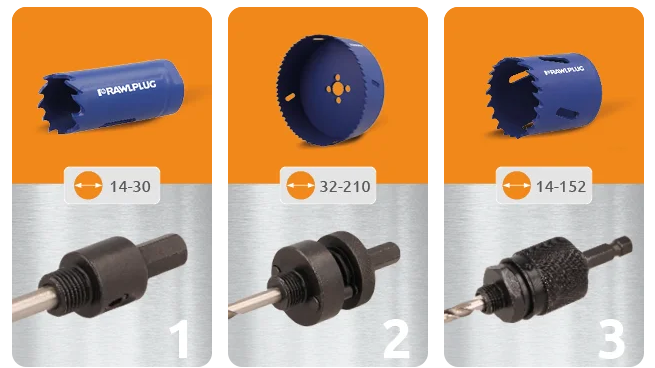Trys skirtingi adapteriai leidžia dirbti su įvairių diametrų karūnomis (20–210 mm).